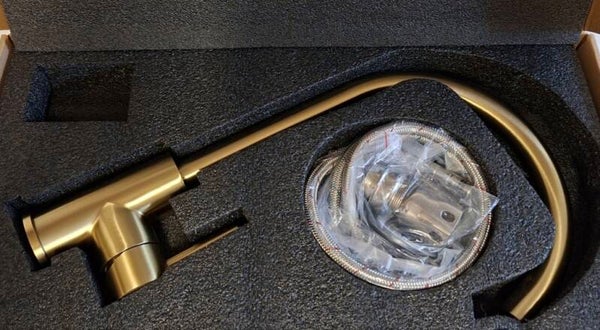 Keukenkraan met gebogen uitloop in de kleur geborsteld goud.Hoogte: 34 cmMateriaal: rvsMengkraan met een keramisch binnenwerk en uitloop 360° draaibaar.Inclusief aansluitmateriaal.