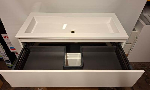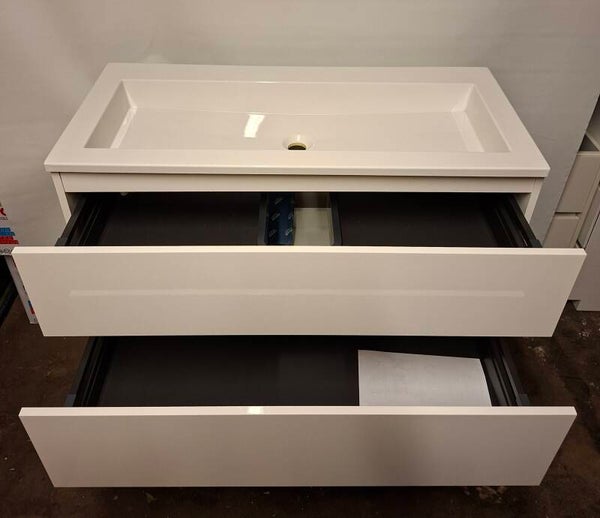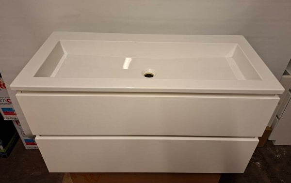 Badkamermeubel in de kleur hoogglans wit. Afmetingen: 100x46 cm Materiaal: mdf Greeploos badkamermeubel voorzien van 2 lades met softclose sluiting en sifon uitsparing. Wastafel van acryl (nog) zonder kraangat (een kraangat is er makkelijk in te boren)