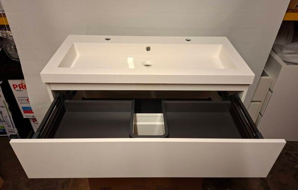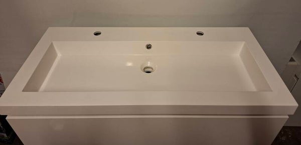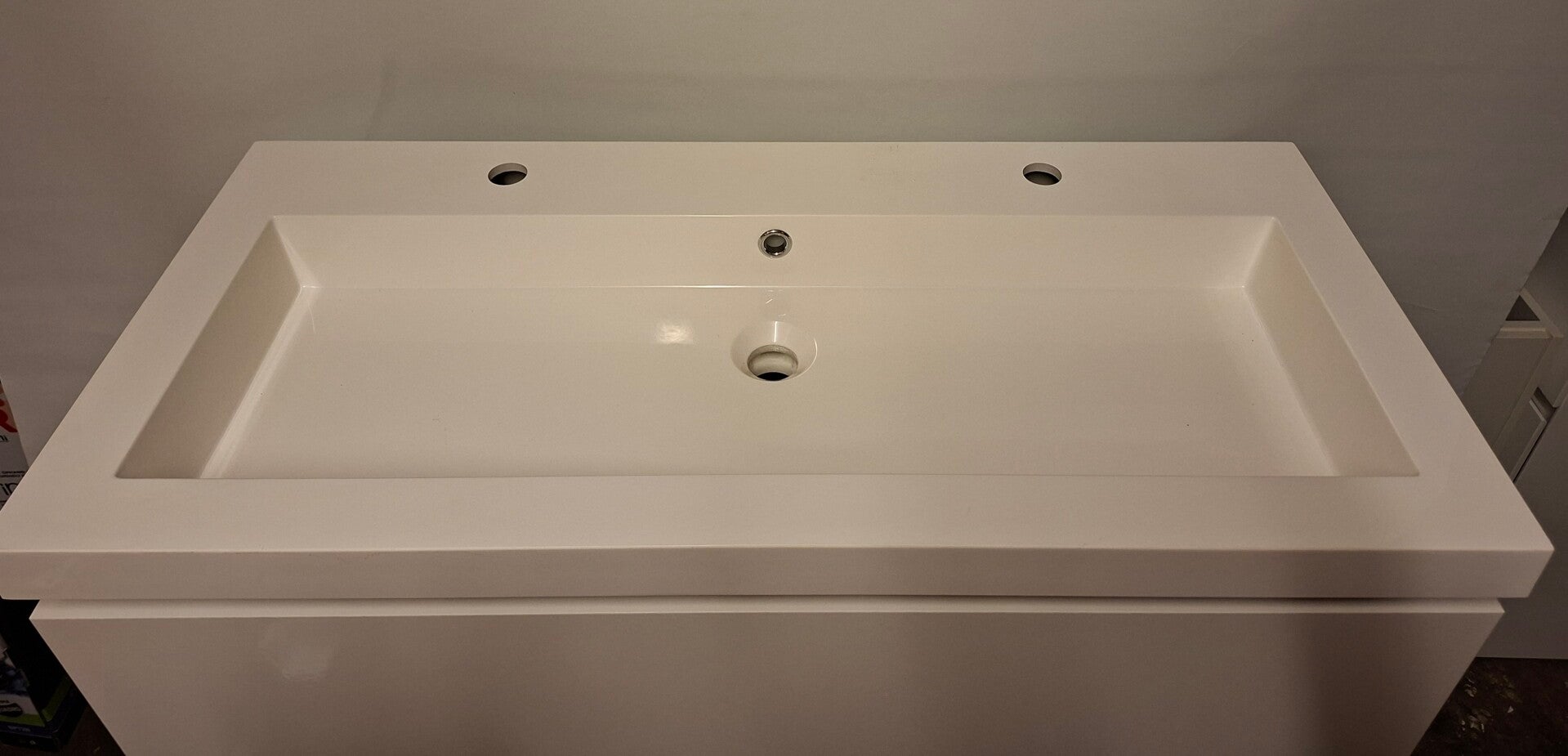 Badkamermeubel in de kleur hoogglans wit.Afmetingen: 100x46 cmMateriaal: mdfGreeploos badkamermeubel voorzien van 2 lades met softclose sluiting en sifon uitsparing.Wastafel mineraalmarmer voorzien van 2 kraangaten en overloop.
