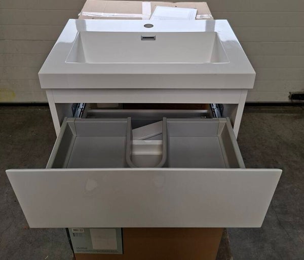 Ondiep badkamermeubel in de kleur hoogglans wit.Afmetingen: 60x38x55 cm (BxDxH)Materiaal: mdfGreeploos badkamermeubel voorzien van 2 softclose lades met sifon uitsparing.Wastafel van mineraal marmer voorzien van 1 kraangat en overloop.