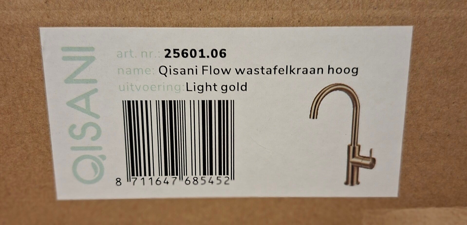 Wastafelkraan Qisani Flow gebogen geborsteld goud.Materiaal: RVS geborsteld.Hoogte: 29,2 cmHoogte uitloop: 20,5 cmMengkraan met keramisch binnenwerk.EAN 8711647685452 (€459)