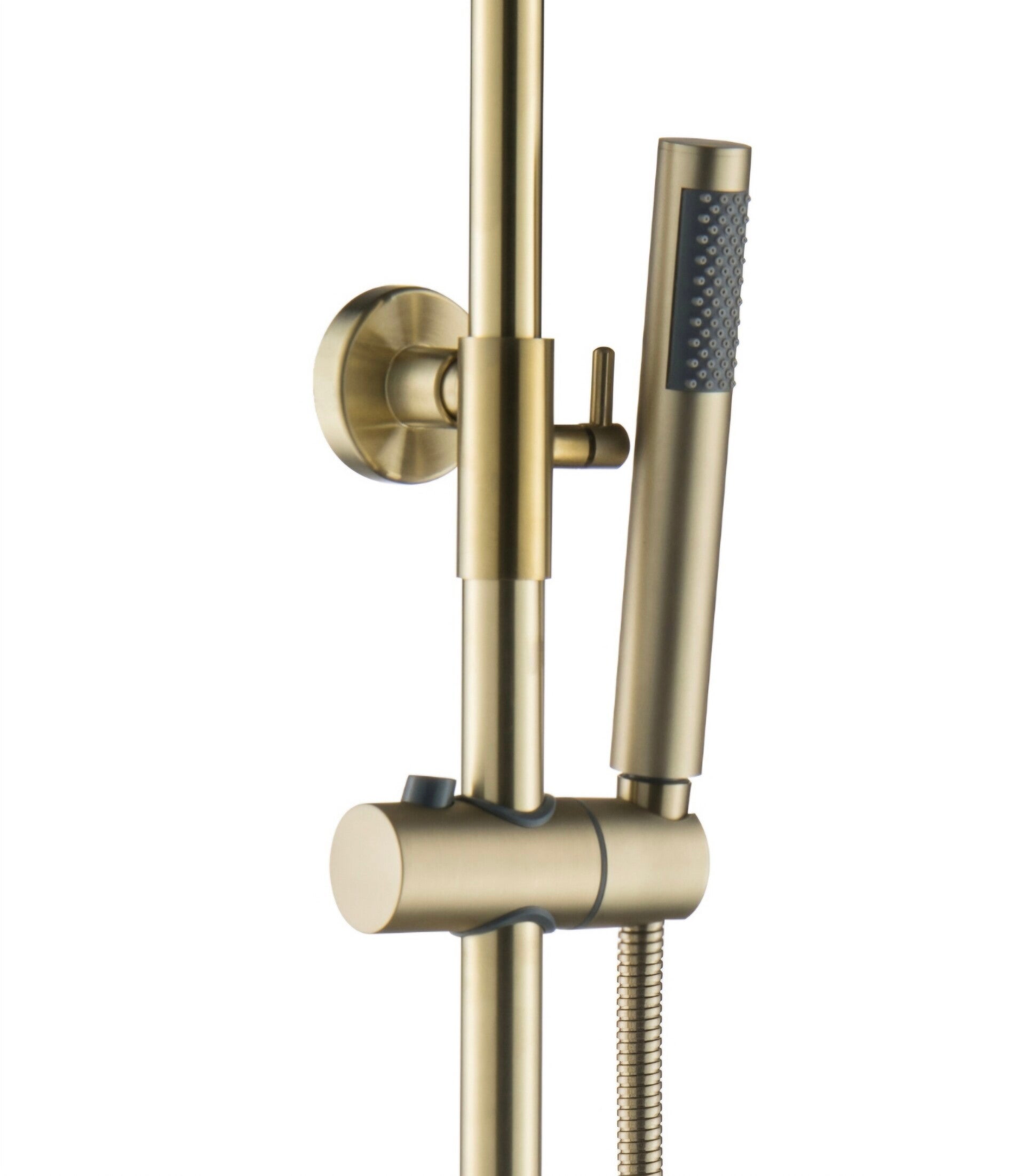 Opbouw regendoucheset geborsteld goud met thermostatisch mengkraan.